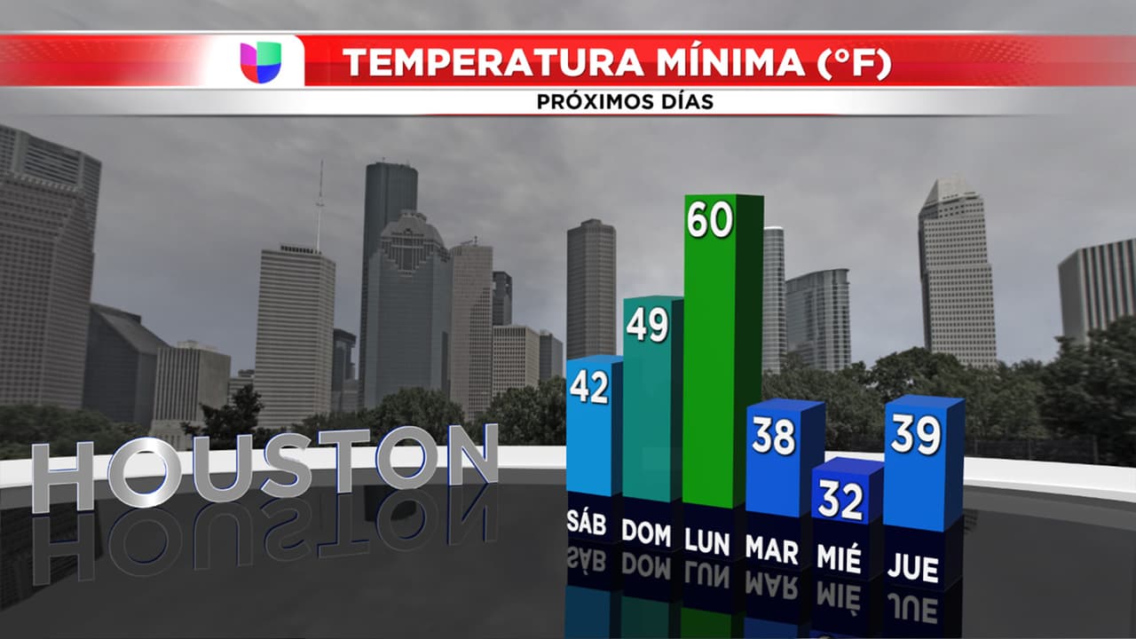 La entrada de un frente frío en la región a partir del lunes por la tarde provocará un bajón significativo en las temperaturas. Se espera que el termómetro marque temperaturas de 32 grados para Houston y que la sensación térmica esté por debajo de los 30.