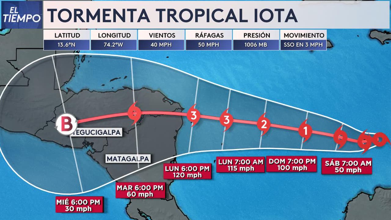 La tormenta tropical Iota se encuentra en aguas del Caribe y se pronostica que impacte directamente como categoría 3, con vientos sostenidos máximos de 120 millas por hora (mph), entre Honduras y Nicaragua entre el lunes o martes.