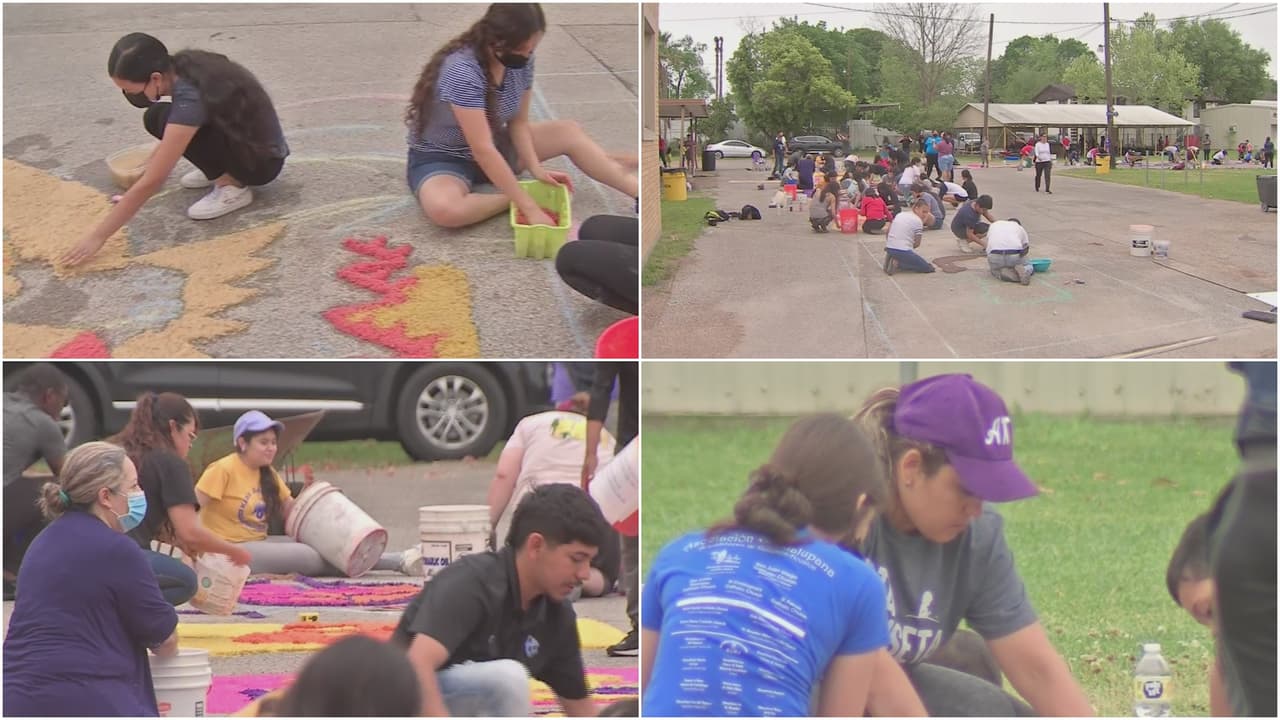Parroquianos diseñaron alfombras de polvo de colores con motivo de la pasión de Cristo. Este