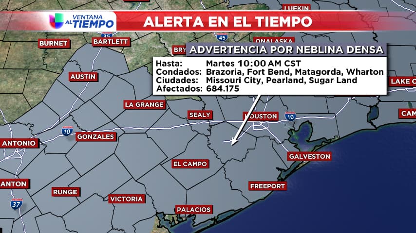 El NWS informó que la alerta de niebla también incluía a los condados Burleson, Madison y Brazos, con posibilidades de que otras áreas fueran afectadas en horas de la mañana.