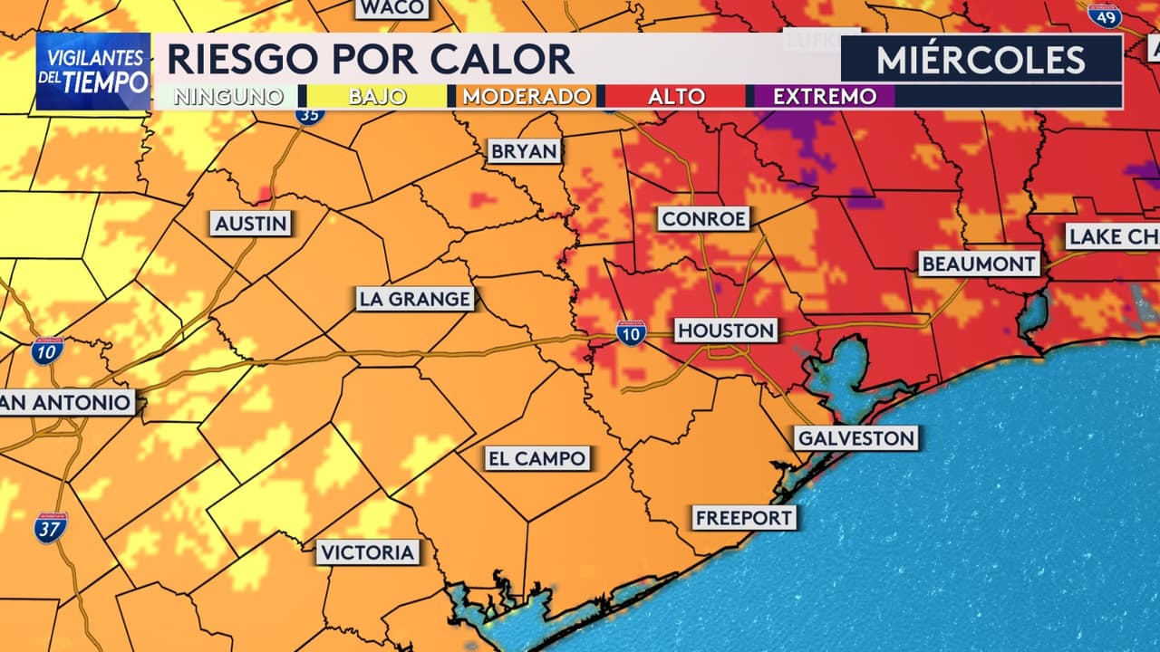 Gastón Heredia, jefe de meteorología de Univision 45, advierte que entre las 3pm y 5pm, de este miércoles 30 de julio, el índice de calor llegará a los 105°F en el área de Houston. Además, menciona que hay un aviso por mala calidad del aire que estará vigente hasta las 6:45pm.