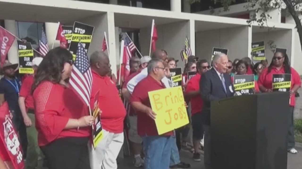 El Congresista texano se reunió afuera de la importante firma de telefonía con empleados del sindicato para demostrar su apoyo. Las presiones para que las grandes empresas no se lleven empleos de Estados Unidos a otros países continúan.