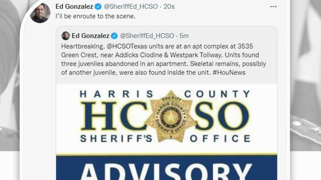 Autoridades investigan el hallazgo de tres menores abandonados y los restos de otra persona, según dijo Ed González, alguacil del condado Harris.