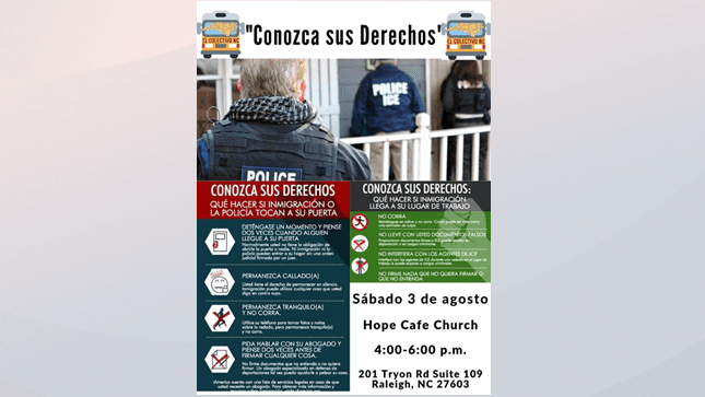 Tal es el caso del Colectivo NC, conformado por 24 grupos de base organizaciones y aliados en Carolina del Norte que llevarán a cabo varios talleres titulados “Conozca sus Derechos”.