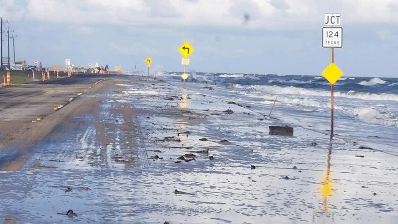 La alta marea y el fuerte oleaje ocasionaron inundaciones en la Península Bolívar y el Distrito Escolar de Galveston retrasó las clases en algunas escuelas.