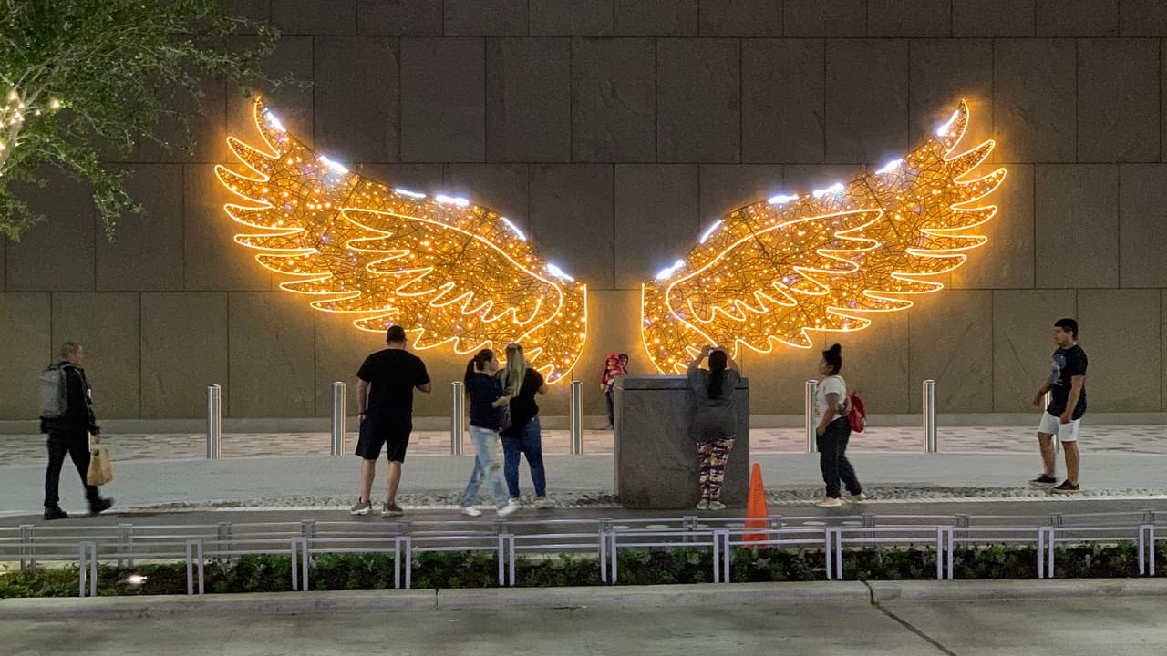 Las luces más populares son estas enormes alas de ángel en la pared de uno de los edificios del centro de Houston.