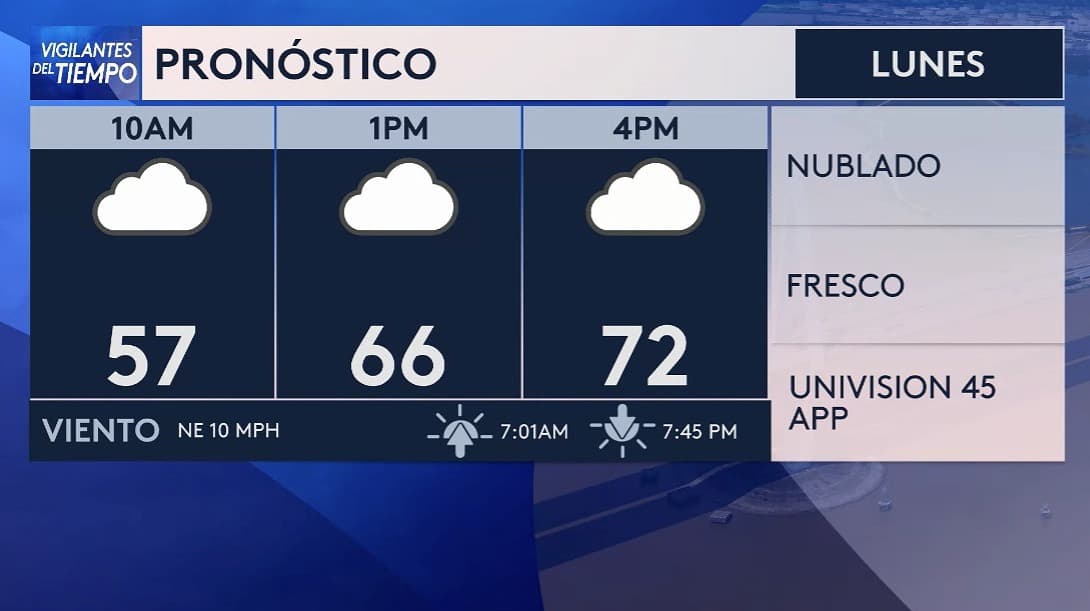 Gastón Heredia, jefe de meteorología de Univision 45, explica que las máximas estarán en los 75ºF. Además, aclara que las precipitaciones y los riesgos de tormenta llegarán a partir de la noche del martes.