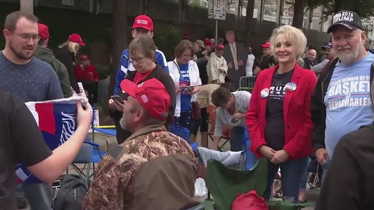 Manifestantes acuden al Toyota Center de Houston para presenciar el discurso de Trump