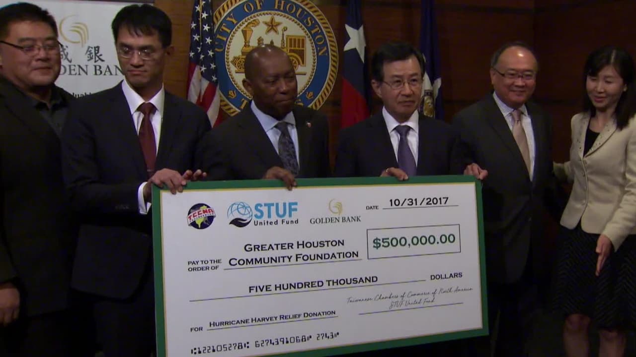 Representantes de instituciones bancarias le entregaron al alcalde de la ciudad dos cheques, uno por 500,000 dólares y otro por 80,000. Con esta donación, se cuenta con más de 96 millones de dólares disponibles para la asistencia de residentes afectados por el huracán Harvey.