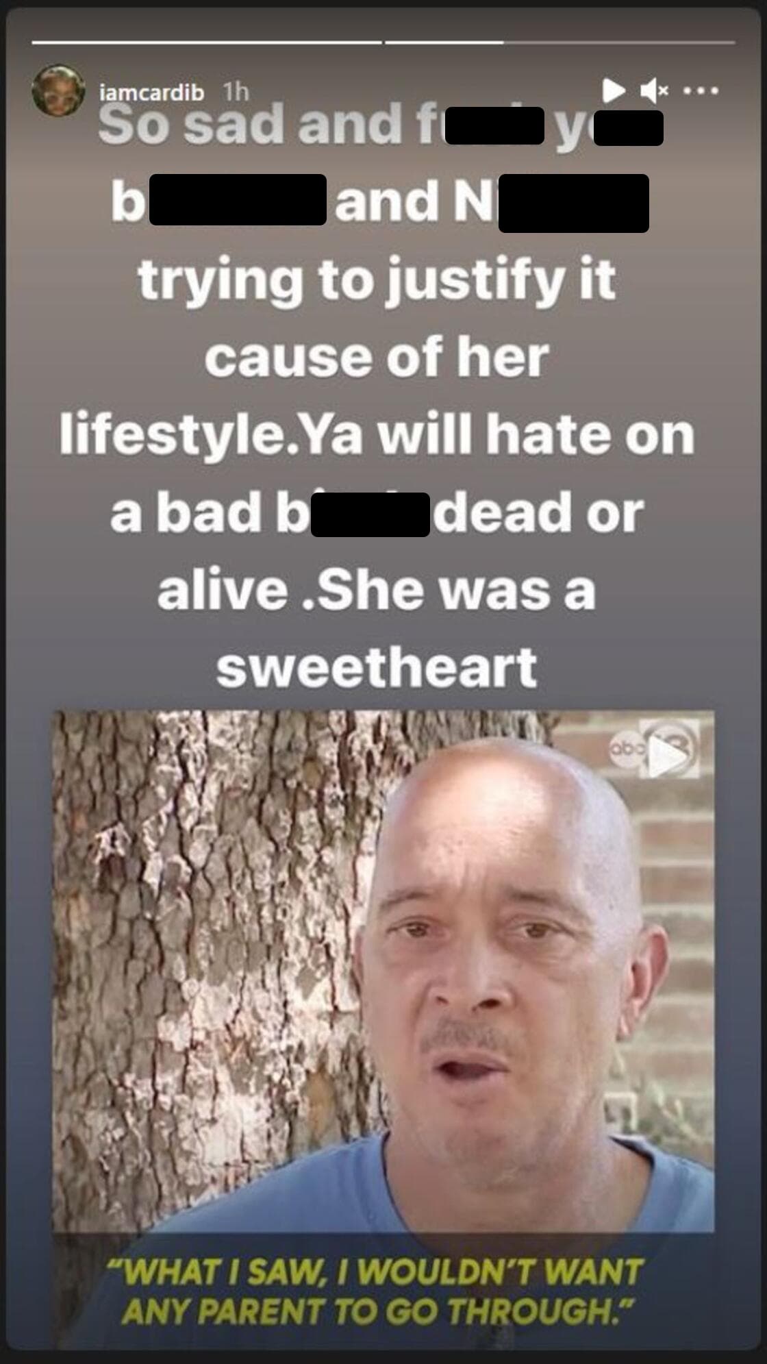 "Tan triste, tratando de justificarlo por su estilo de vida", escribió Cardi defendiendo a la modelo de Houston y criticando a las personas que acusaban su muerte por el estilo de vida que llevaba en redes sociales.
