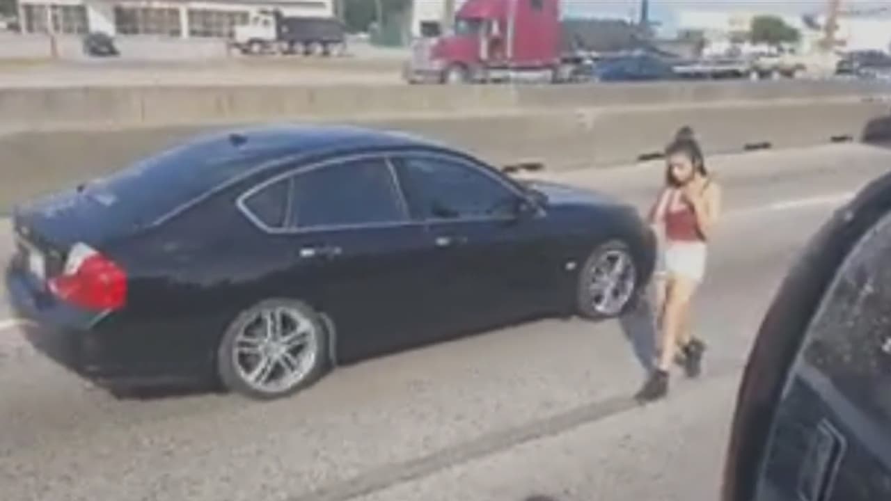 Mujer camina en medio de una autopista mientras habla por teléfono