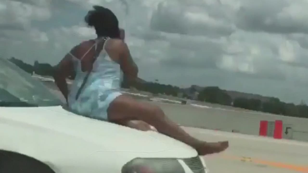 Mujer fue captada sobre el cofre de un auto en movimiento en la carretera 290