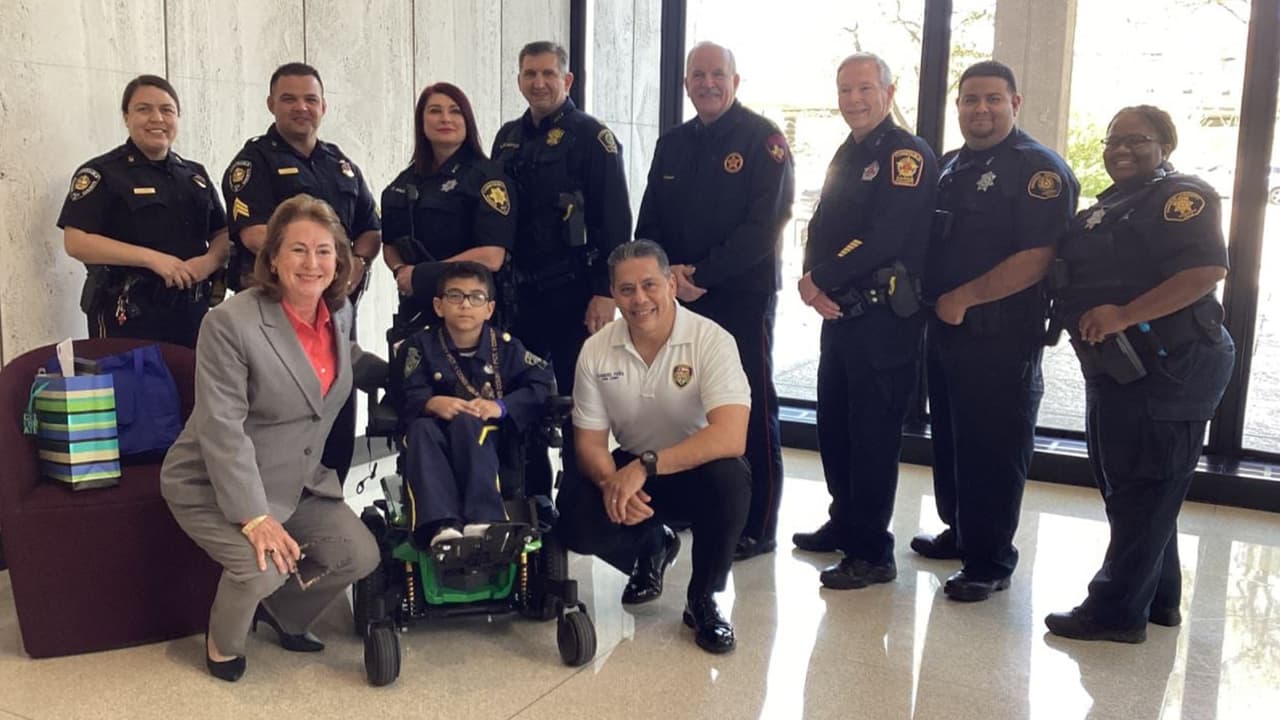 Michael Martínez, de 8 años, llegó a la primaria de Humble vestido de policía y fue víctima de acoso escolar, un estudiante se burló de él y lo intentó tirar de la silla de ruedas. Al día siguiente el pequeño regresó al plantel nuevamente con su uniforme y escoltado por oficiales de la ley.