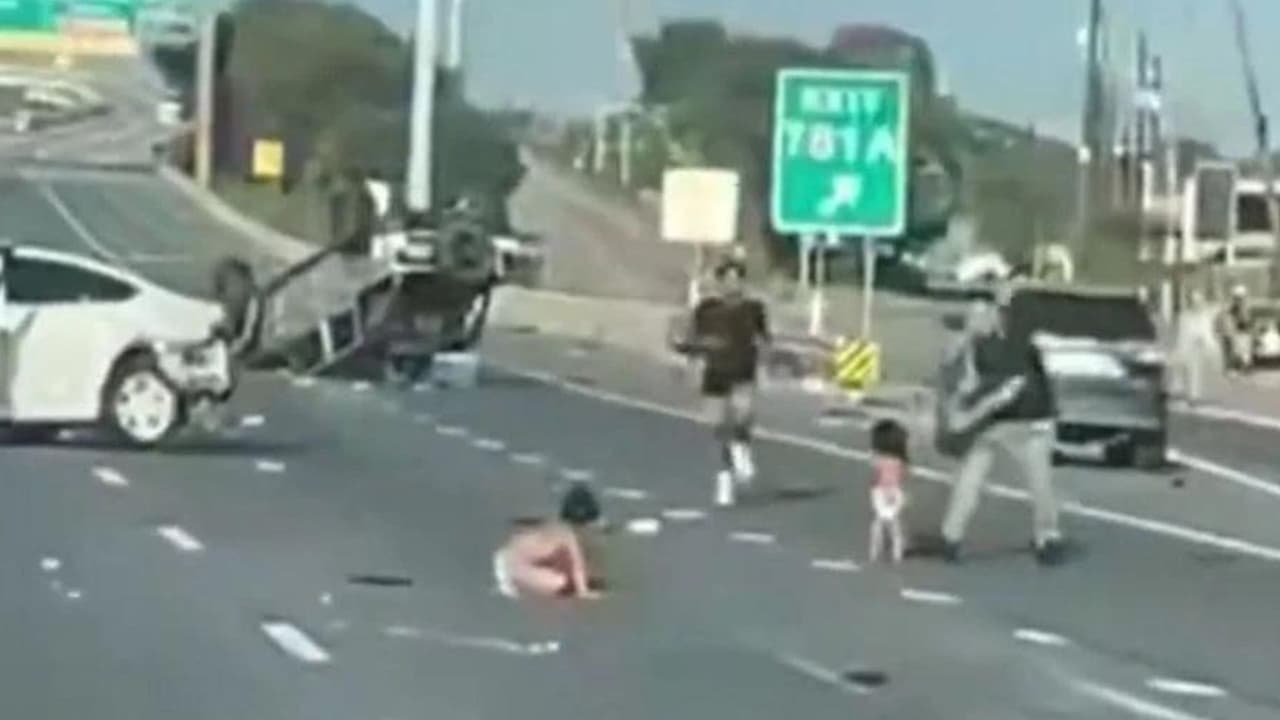 Los dos niños, de 1 y 4 años, que solo vestían pañales, quedaron en medio de los carriles principales del East Freeway, pero se levantaron por su cuenta.