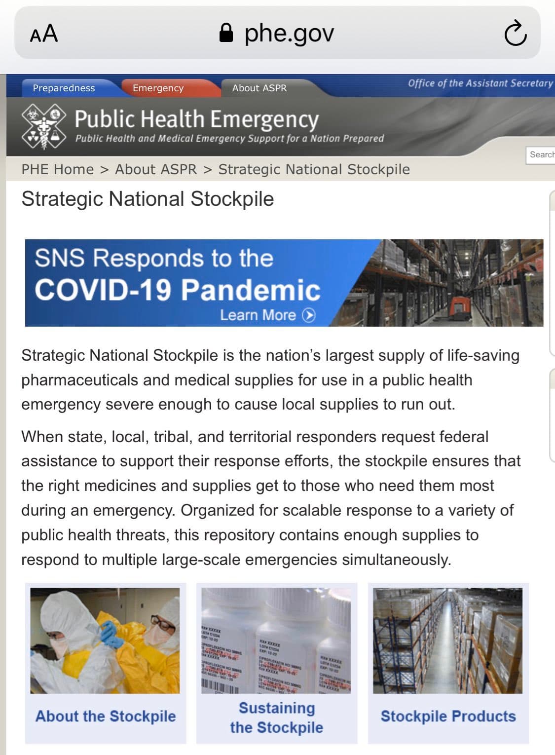 Many are asking about an update to the ASPR website. ASPR first began working to update this text a week ago to more clearly explain the role of the Strategic National Stockpile. HHS has been using this same language in statements to the press for weeks now.