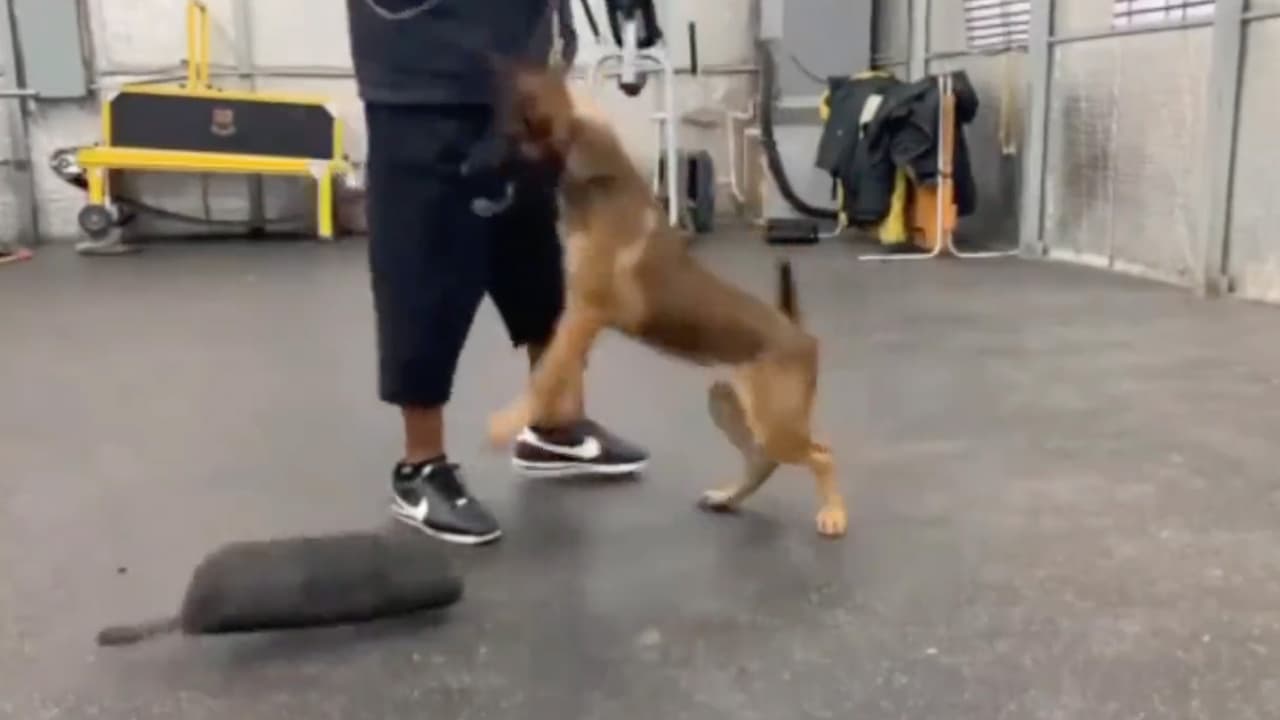 En principio, se ve al perro mordiendo una almohadilla al tiempo que el entrenador le da una orden.