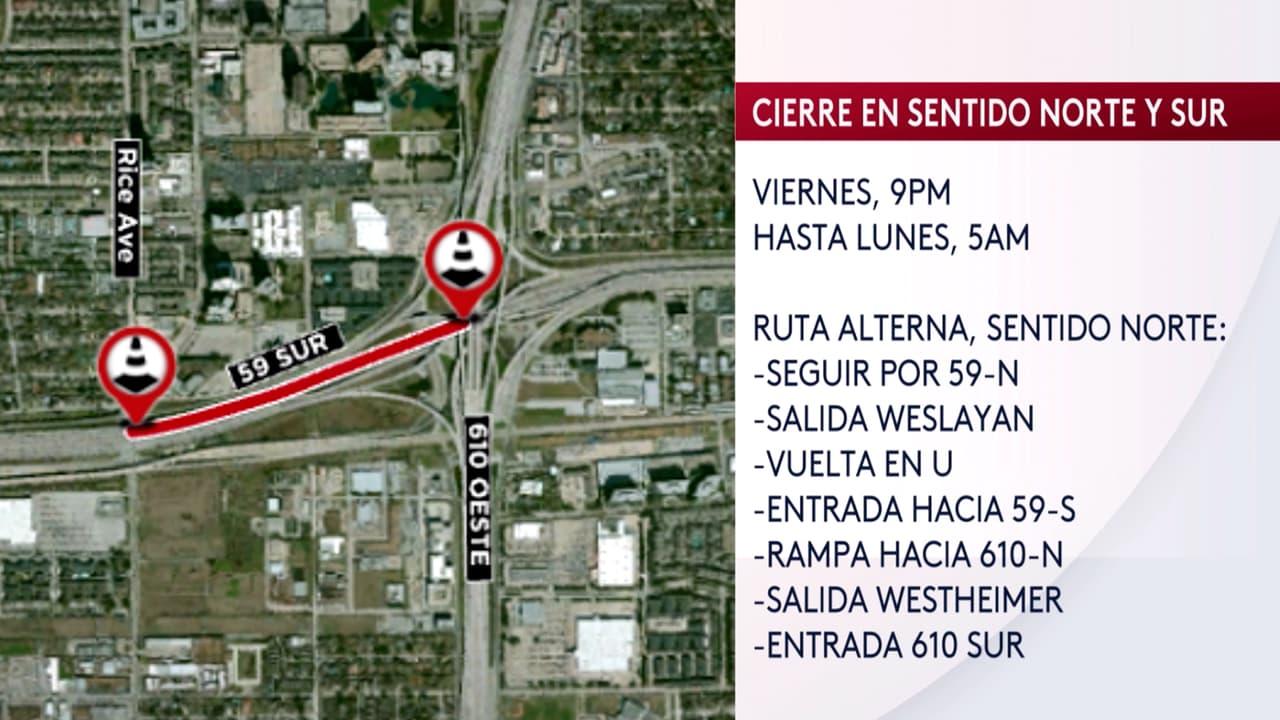 Uno de los cierres en Houston este fin de semana es la rampa conectora de la 59 hacia la 610. Aquí te presentamos el reporte para que tomes rutas alternas y evites el tráfico.