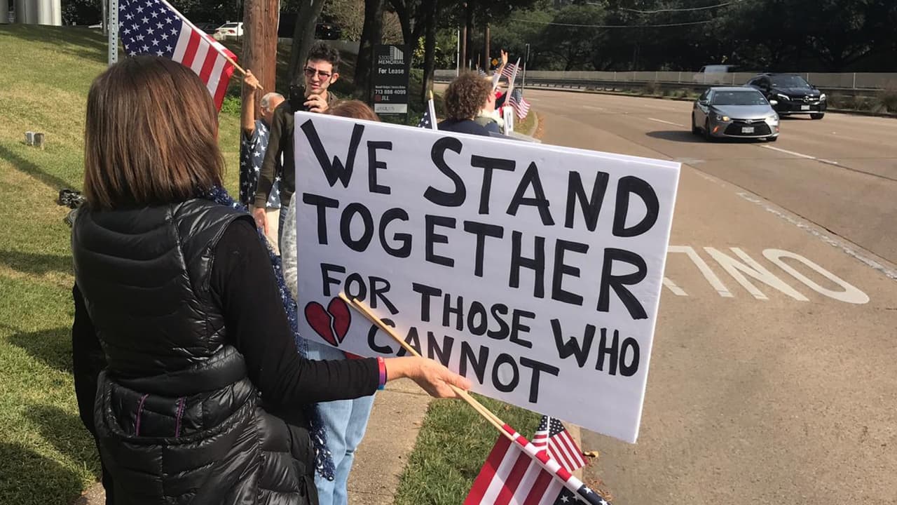 Protesta frente a la oficina del senador John Cornyn por el trato inhumano a los miembros de la caravana