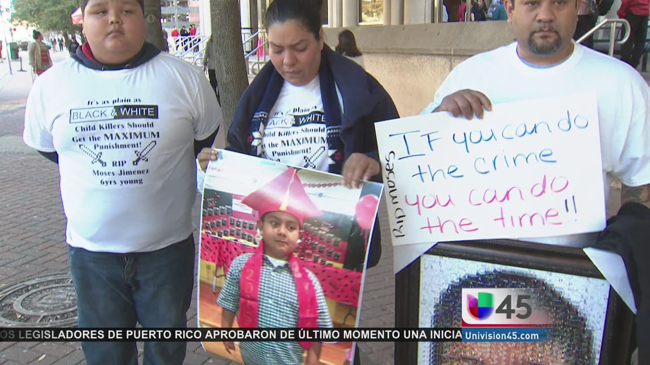 Familiares del niño Moisés Jimenez, de 6 años, quien murió el año pasado en un tiroteo a su vivienda, se manifestaron frente a una corte pidiendo justicia para su pequeño