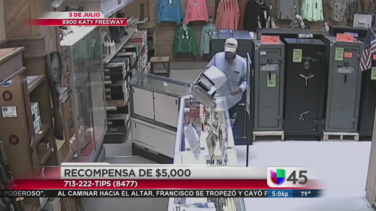 Un video de seguridad muestra el momento en que una pareja entra a una tienda de armas y mientras la mujer distrae al cajero el hombre toma un arma y se guarda entre la ropa.