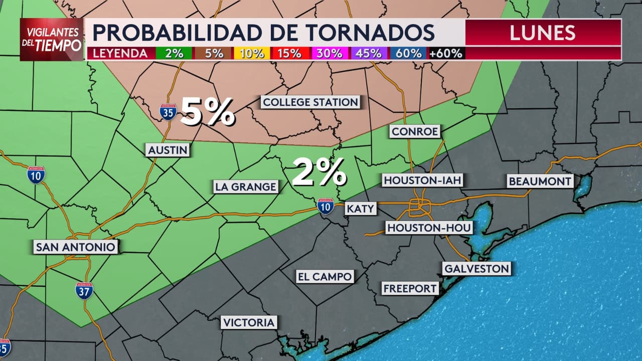 Durante la noche del lunes y la madrugada del martes se espera lo más fuerte para el área de Houston: el jefe de meteorología de Univision 45, Gastón Heredia, no descarta que en algunas zonas se pueda registrar granizo, fuertes ráfagas de viento y tormentas. Hay una muy baja probabilidad de tornados.