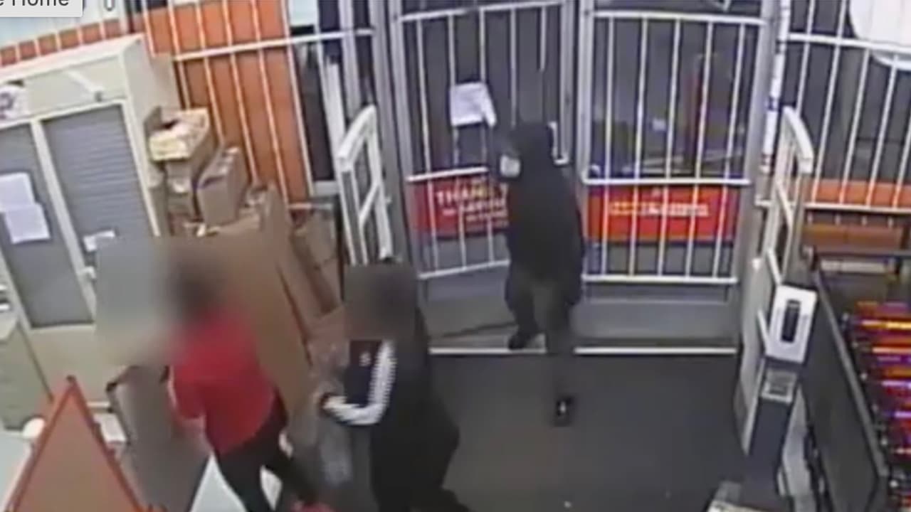 El hombre se acercó a los empleados cuando estaban cerrando por la noche y les dijo que regresaran a la tienda. Uno de ellos trató de regresar corriendo al establecimiento y cerró la puerta, dejando accidentalmente al otro empleado afuera con el sospechoso.