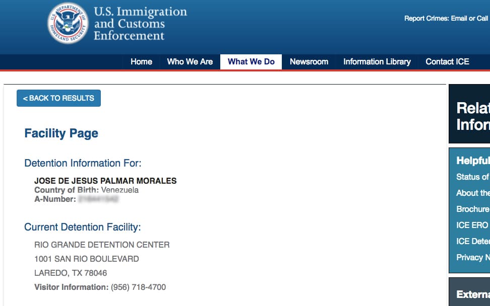 En una página de internet de la Agencia de Inmigración y Control de Aduanas, (ICE), que permite buscar información de inmigrantes recluidos en centros de detención de la agencia, figura que José de Jesús Palmares Morales, de origen venezolano, se encuentra bajo custodia.