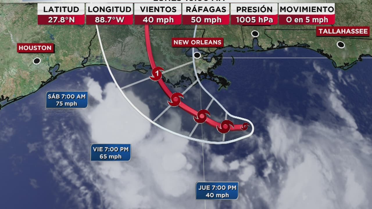 Se pronostica que la tormenta llegue al área de Luisiana durante las primeras horas de la mañana del sábado. Por el momento se mueve con vientos de 40 millas por hora y podría intensificarse a huracán de categoría 1 antes de tocar tierra. Según las proyecciones, el fenómeno se aleja un poco del área de Texas.