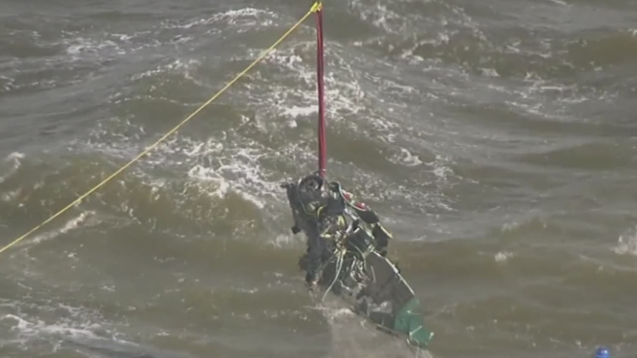 Autoridades militares continúan con los trabajos de rescate para encontrar el cuerpo de uno de los tripulantes del helicóptero que cayó a las aguas de la terminal de cruceros de Bayport.