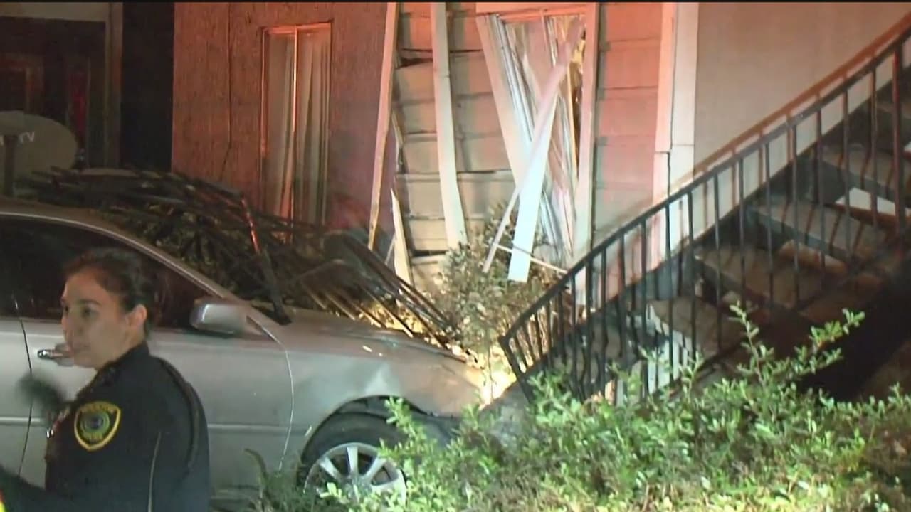 Un auto termina incrustado en un complejo de apartamentos después de que su conductora perdiera el control