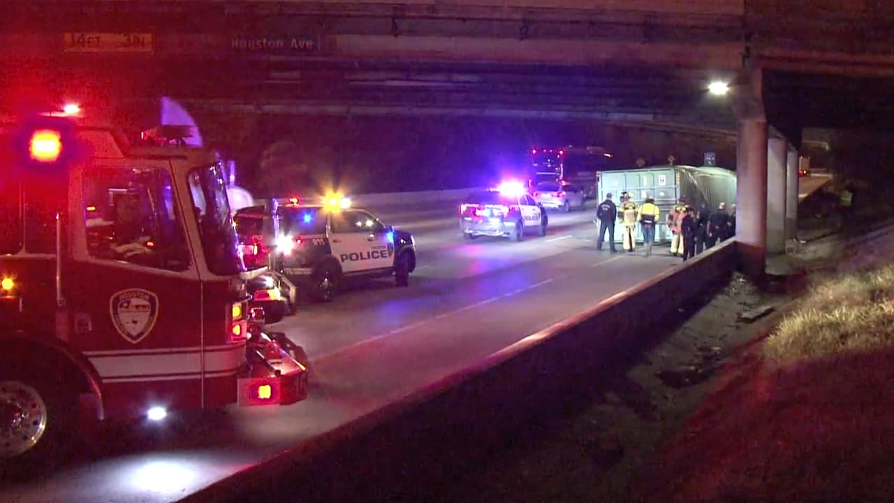 Un camión de carga choca con un puente y deja un contenedor tirado en una vía cerca del centro de Houston