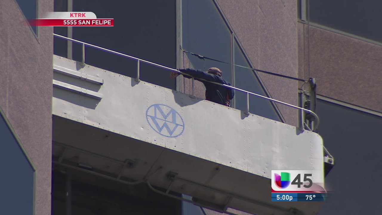Los bomberos de Houston lograron rescatar sanos y salvos a dos trabajadores limpia vidrios cuyo andamio se quedó sin electricidad en las alturas de un edificio
