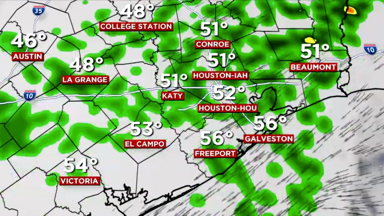 Un jueves lluvioso para el área de Houston con temperaturas en el rango medio de los 50 grados