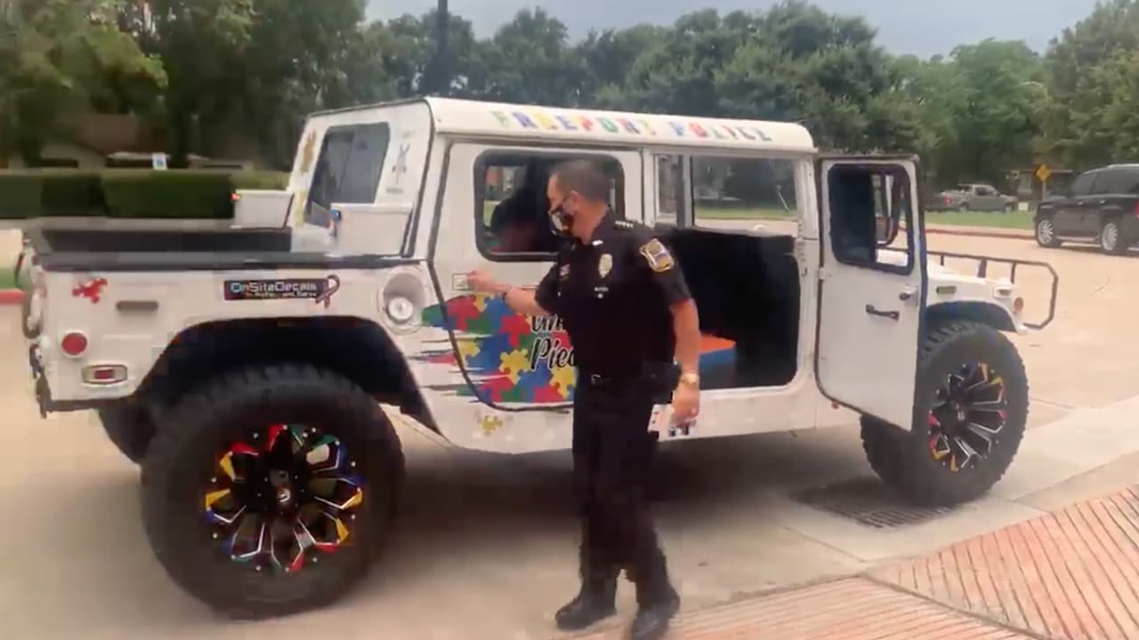 Un niño autista llega a su primer día de clases en una colorida patrulla de la Policía de Freeport