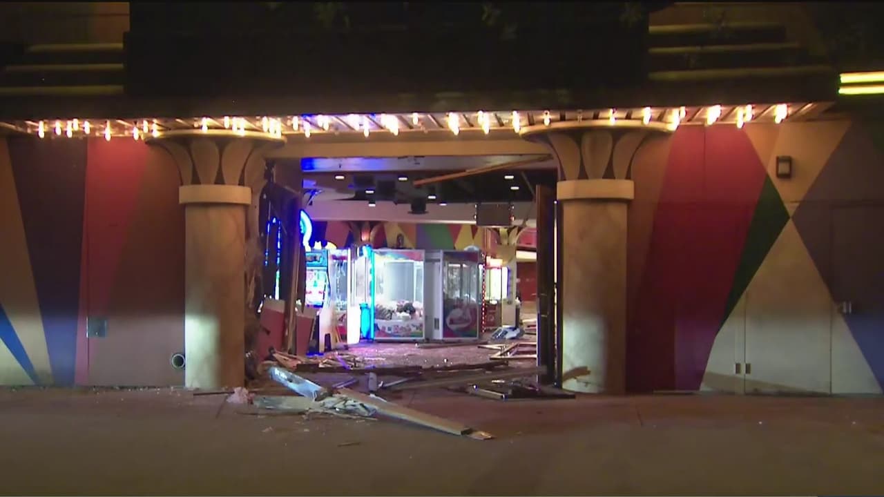 Según los informes, varios sospechosos chocaron el vehículo de marca Dodge contra la fachada del edificio del cine Edwards esta madrugada. Aún se desconoce el monto de lo robado y si entre los objetos se encontraba un cajero automático.