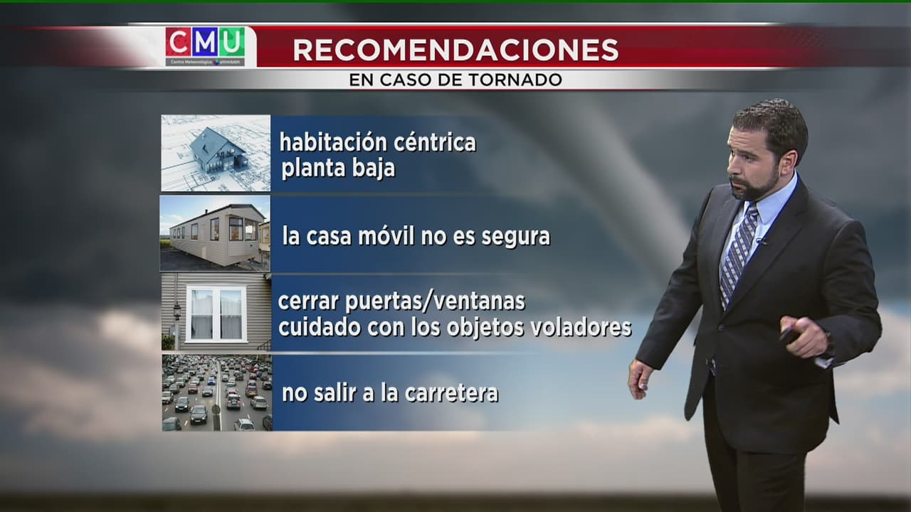 Esté alerta a las actualizaciones del tiempo, especialmente ante avisos de tornados. Se esperan fuertes lluvias y hay advertencia de inundaciones.