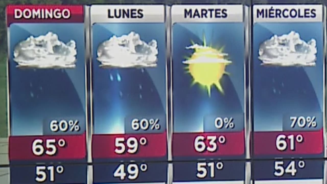 Durante la tarde del domingo, se espera un descenso en las temperaturas asociado con el paso de un frente frío por la región. Las máximas alcanzarán solo los 55 grados.