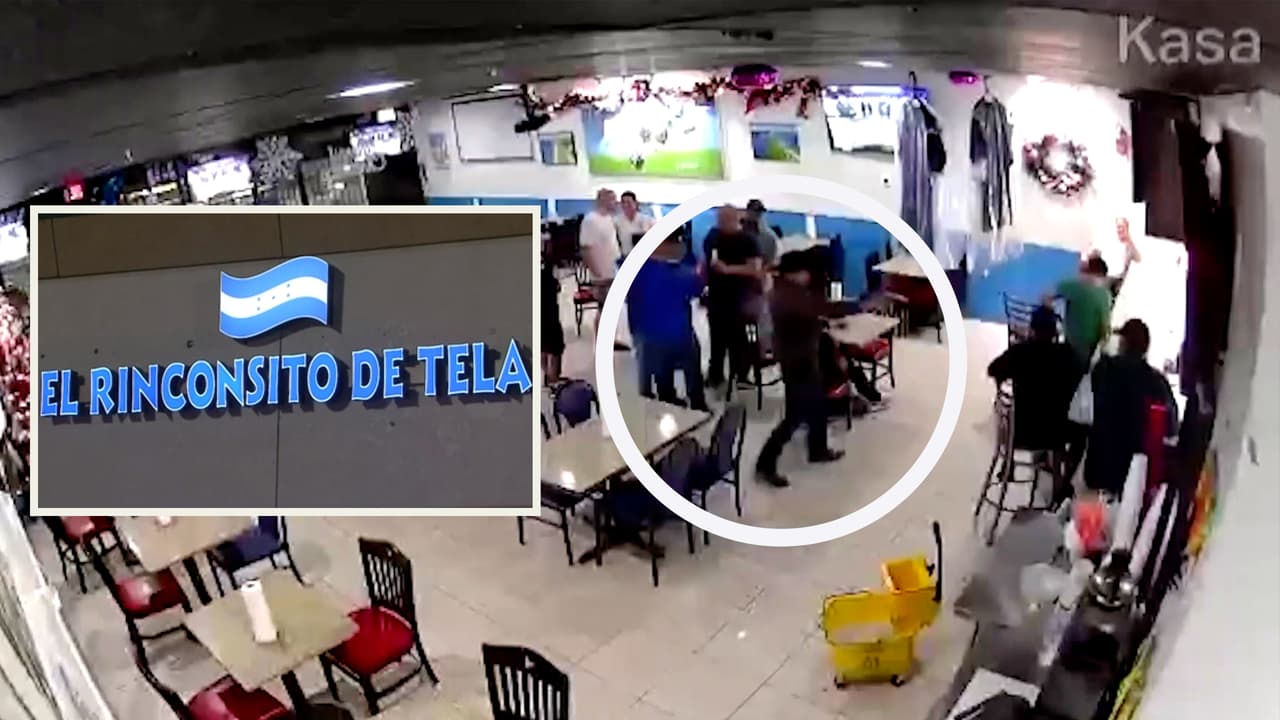 Las imágenes muestran el momento en el que un hombre saca un arma y le dispara a un hispano, luego se dirige a la puerta de entrada del restaurante ‘El Rincosito de Tela’, pero otros clientes le impiden salir y lo retienen hasta que llega la policía.