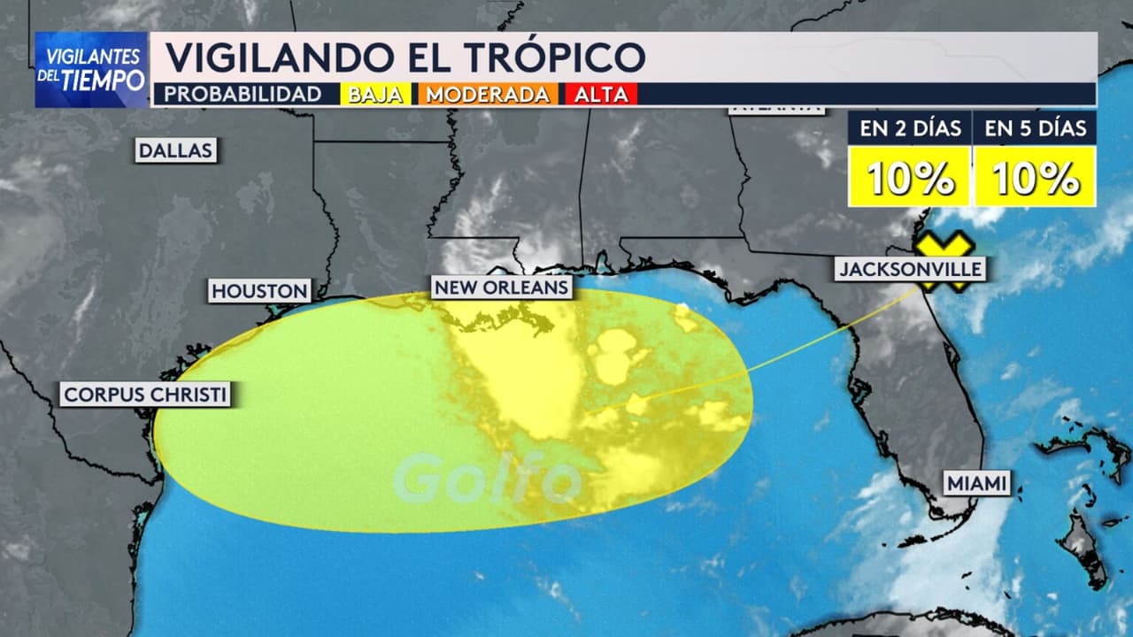 El Centro Nacional de Huracanes informó sobre un disturbio tropical con apenas 10% de probabilidad de convertirse en depresión o tormenta en el Golfo. Se prevé que el sistema genere lluvias en la costa de Texas entre viernes y sábado, sin riesgo de vientos fuertes.