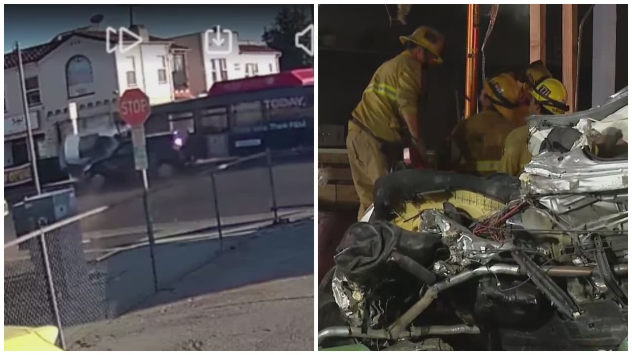 Videos de cámaras de seguridad muestran el momento exacto en que un vehículo cruza una calle con exceso de velocidad e impacta contra un autobús, provocando serios daños en un edificio en Long Beach, y ocasionando heridas a unas 14 personas.