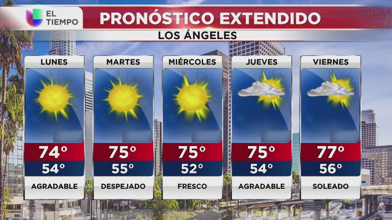 Según el pronóstico, las ráfagas al norte del condado de Los Ángeles podrían alcanzar velocidades de hasta 50 mph. Los niveles máximos del termómetro estarán en los 74 grados Fahrenheit, mientras que los mínimos serán de 54 grados.