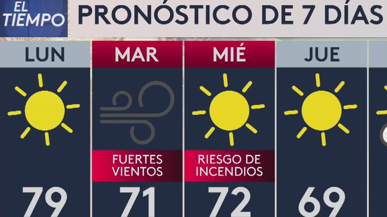 El pronóstico indica que durante la jornada las temperaturas máximas alcanzarán los 79 grados Fahrenheit y las mínimas los 51 grados. Hay una vigilancia por vientos fuertes debido a que se anticipan ráfagas de más de 65 millas por hora, lo que sumado a la baja humedad aumenta el riesgo de incendios. No se prevén lluvias.