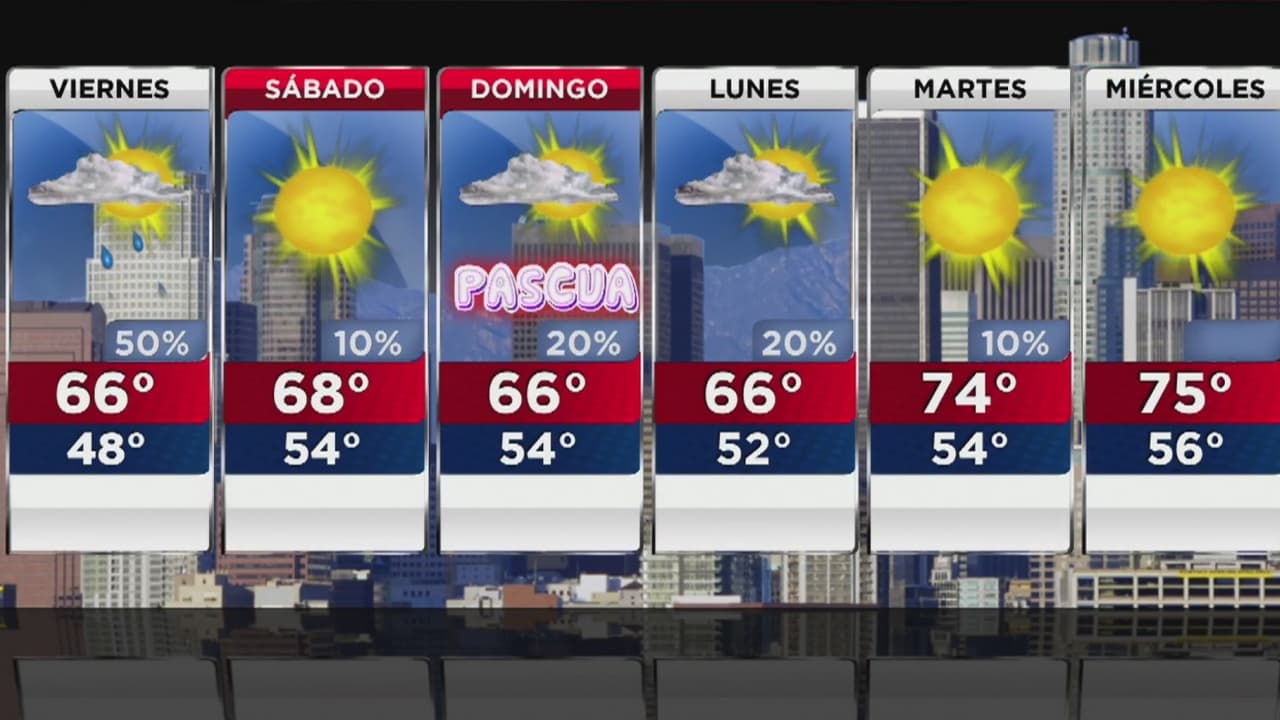 El pronóstico indica que durante la jornada las temperaturas máximas alcanzarán los 66 grados Fahrenheit y las mínimas los 48 grados. Hay 50% probabilidad de precipitaciones.