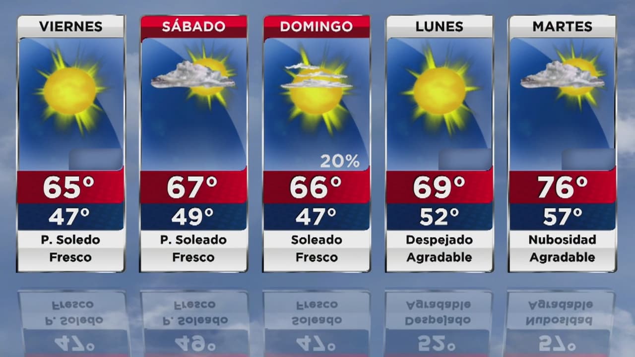 Las temperaturas máximas llegarán a los 63 grados Fahrenheit, las mínimas se ubicarán en los 48, habrá poca nubosidad, no se esperan lluvias y los vientos alcanzarán altas velocidades.