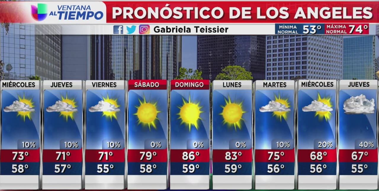 El pronóstico indica que las temperaturas máximas en el área alcanzarán los 73 grados Fahrenheit y las mínimas los 58 grados. La posibilidad de precipitaciones es de 10%.