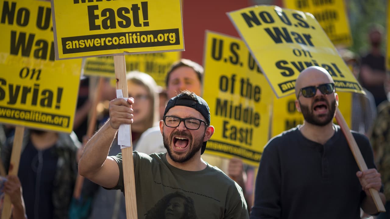 Con pancartas, cánticos y consignas, los manifestantes le pidieron al presidente Trump evitar inmiscuirse en conflictos que más adelante podrían terminar en guerras de escala mundial.