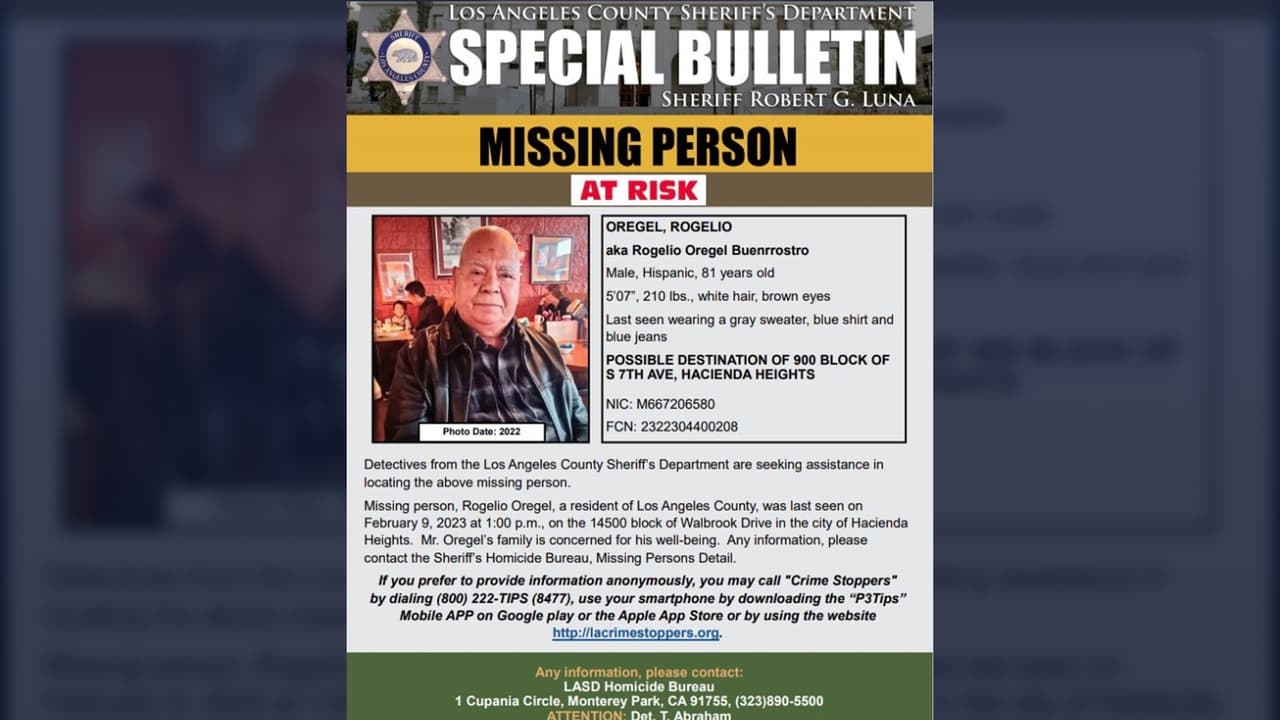 El hombre hispano fue visto por última vez el 9 de febrero de 2023, a la 1:00 p. m., en la cuadra 14500 de Walbrook Drive, en la ciudad de Hacienda Heights.
