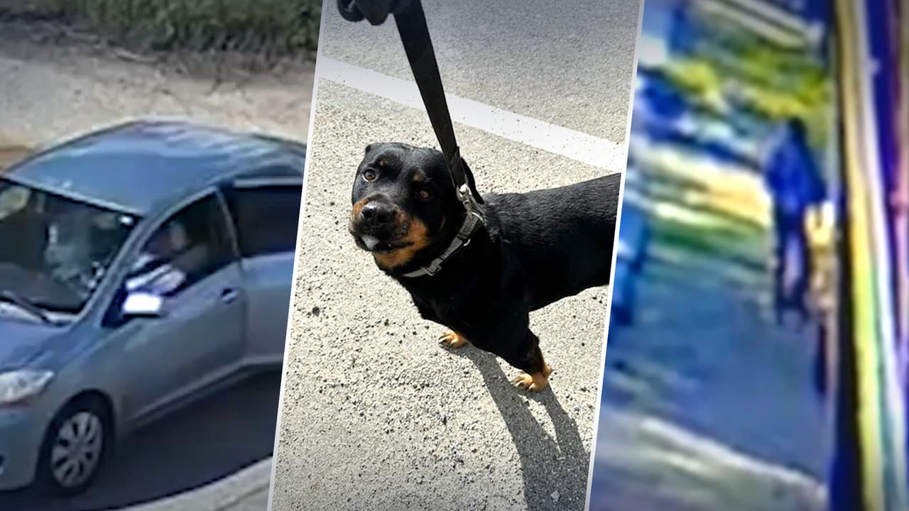 El video muestra un sedán plateado de cuatro puertas que se detiene al costado de la carretera y luego el conductor abre la puerta trasera, se ve como sale el Rottweiler y el vehículo abandonó el área a toda velocidad.