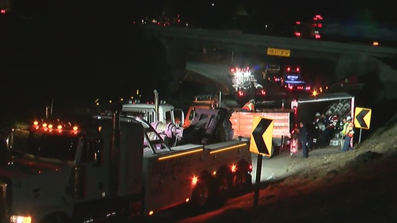 Un camión de carga que perdió el control y se volcó mantiene bloqueados todos los carriles en la transición del 5 sur al 10 este. El conductor salió ileso, pero las labores de limpieza podrían durar hasta 4 horas.