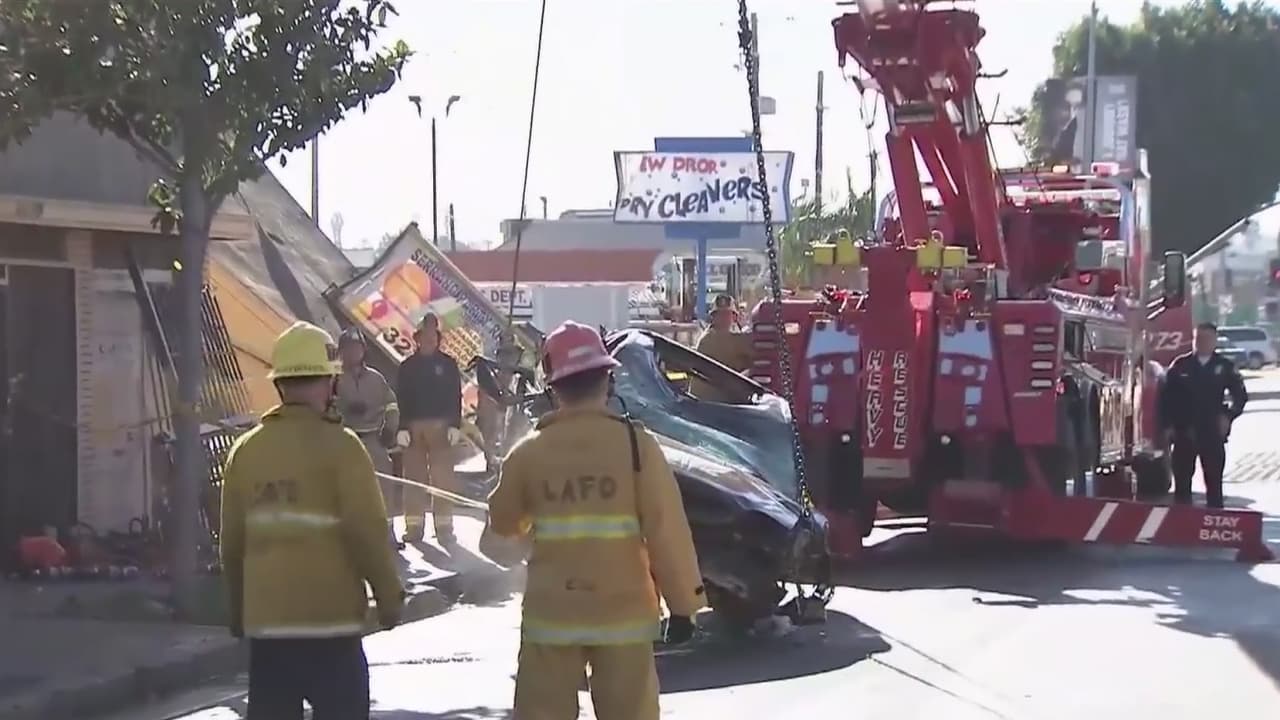 Las autoridades de Los Ángeles informaron que un conductor perdió el control de su vehículo y chocó fuertemente contra un establecimiento comercial. Las dos personas que se transportaban en el automóvil murieron en la escena del accidente.